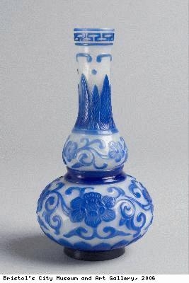 The blue layer of glass is carved in a pattern copying imperial porcelain of the Ming dynasty (1368-1644). Throughout the Qing dynasty (1644-1911) educated people admired the shapes and designs of Ming ceramics and copies of Ming ceramics were popular in the imperial palace.