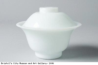 This bowl with lid was probably used for tea. Because this kind of glass imitates white jade it is sometimes known as ‘poor man’s jade’.