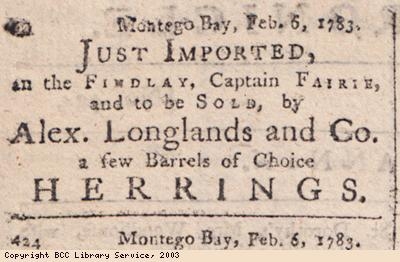 Newspaper extract from The Cornwall Chronicle, Jamaica. Advert for Just Imported herrings. Herrings were fished by British fishing fleets in towns such as Bridgewater, Somerset. They were exported to the Caribbean islands, such as Jamaica, and sold as food for slaves on plantations.
